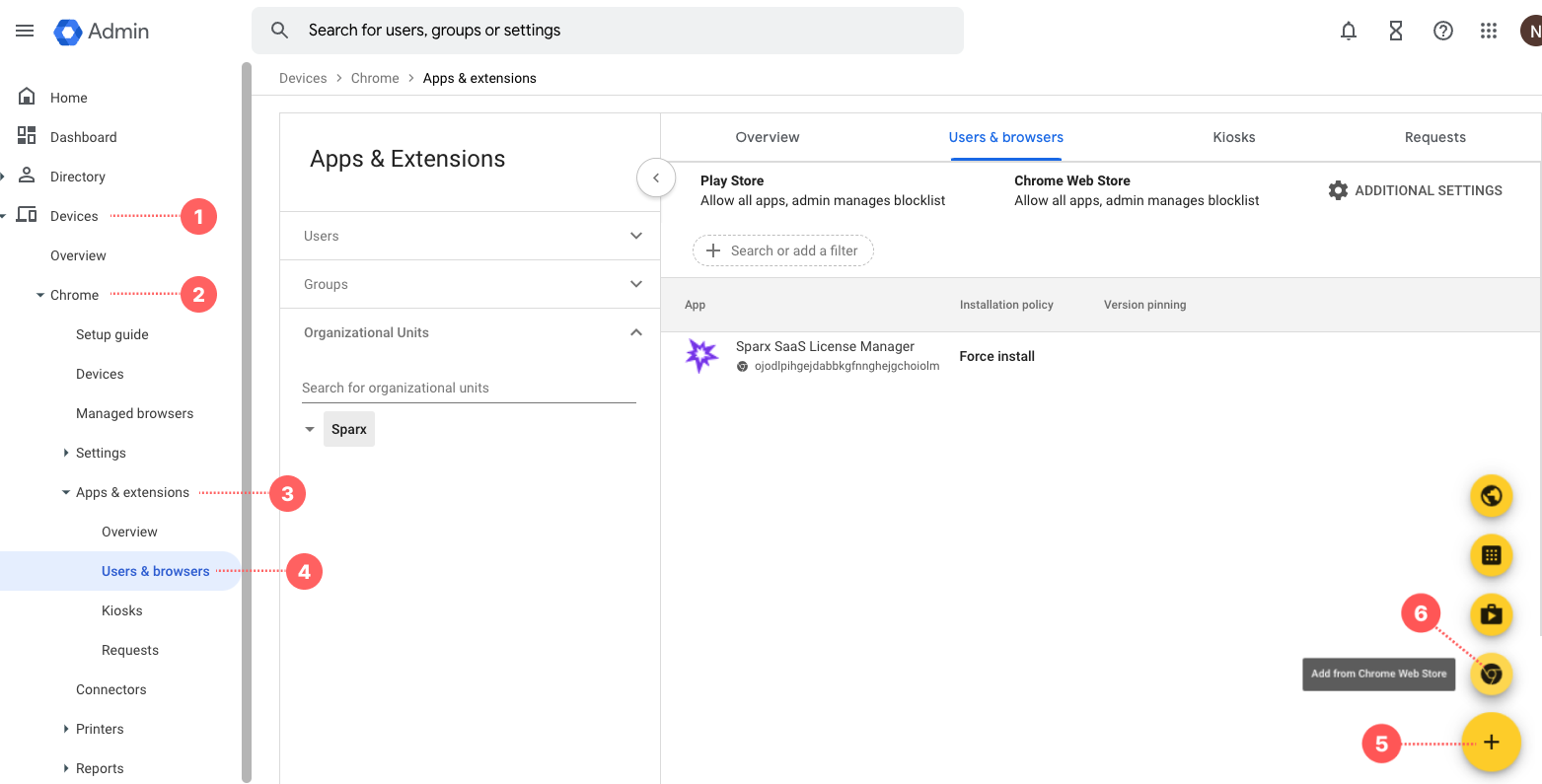 * Go to: **Devices (1) >>&#x20;*****Chrome*****&#x20;(2) >> Apps & Extensions (3)**