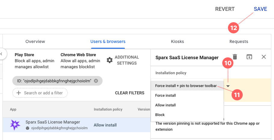 * Once the Sparx Chrome Extension has displayed open the dropdown **(10)** >> select **Force install + pin to browser toolbar (11)** and click **Save (12)**